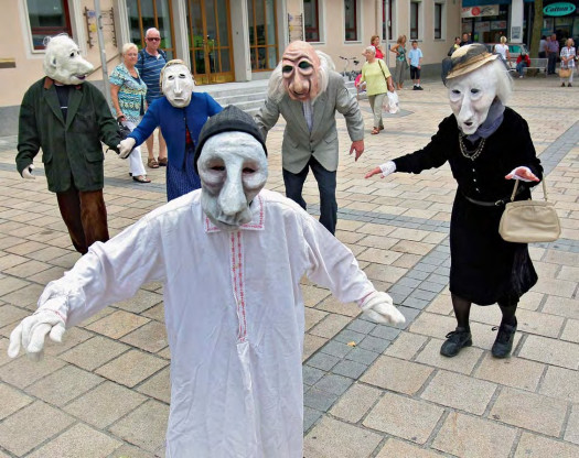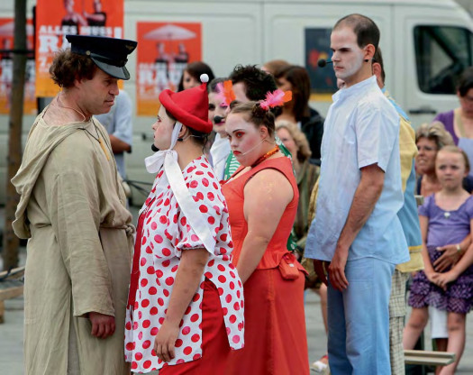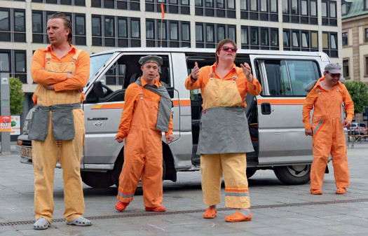 Eine neue Heimat erobern sich „Die Siedler“ auf den Plätzen von Kaiserslautern: Ein Kleinbus fährt vor, der Spähtrupp begutachtet die Umgebung und bereitet mit gewitzten Einfällen gegenüber den fremdelnden Ureinwohnern die Landnahme vor. Ein unterhaltsames Stück Straßentheater über Heimat und Fremde, Extrawurstsemmeln und die Möglichkeiten und Schwierigkeiten des Zusammenlebens – schräg, schrill, lustig und voller Freude am Anders-Sein.