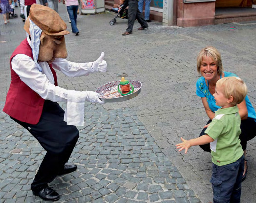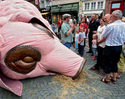 Schwein gehabt! Vor der Stiftskirche liegt am Festivalwochenende unübersehbar ein besonders schönes rosiges Exemplar! Fast zehn Meter misst das Tier, dessen Schnauf- und Schnarchgeräusche deutlich zu hören sind. Nur zehn Personen dürfen sich pro Vorstellung einmal wie ein Ferkel benehmen, auf die Knie gehen und einen Blick in den Bauch werfen – dort werden kleine Bildergeschichten erzählt. Ein Vergnügen für Kinder und natürlich ihre Eltern.