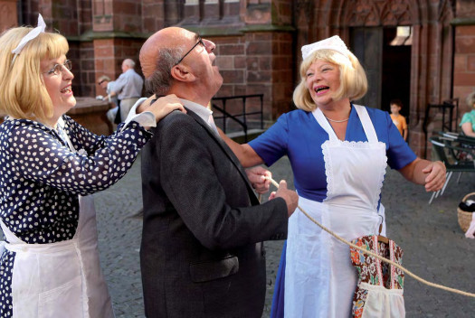Das Blaumeier-Atelier, das seit über 20 Jahren mit seinen integrativen Kunstprojekten weit über Bremens Grenzen hinausstrahlt, hat seine bezaubernden Zimmermädchen mit ihren Wäschekörben und den neuesten Stadtgerüchten nach Kaiserslautern geschickt. Diese „Süßen Frauen“ haben reichlich Arbeit mit all der Wäsche, da ist man für jede helfende Hand im Publikum dankbar.