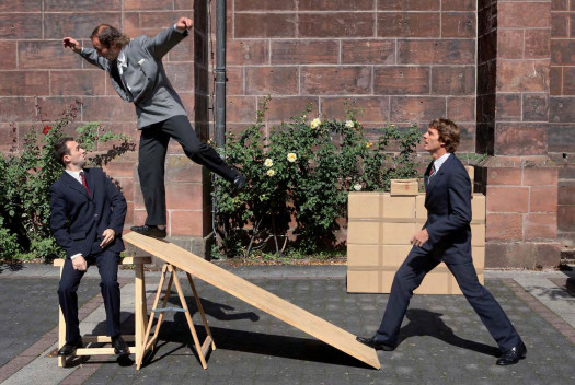 Ein Besen, ein Weißbrot, eine Tasse Kaffee, ein vergessenes Buch auf einer Bank – so normal und alltäglich wie die Gegenstände und kleinen Nebensächlichkeiten unseres Lebens, von denen sie sich inspirieren lassen, scheinen auch die Herren der deutsch-französischen Compagnie Les Apostrophés – allerdings nur beim ersten Hinsehen. Denn was die Tänzer, Jongleure und Artisten berühren, erwacht zu neuem Leben: Ein Baguette wird zum Tanzpartner, leere Kartons fügen sich zu einer quicklebendigen Skulptur - man muss nur den Akkordeonklängen folgen und schon entspinnen sich kleine charmant-absurde Szenen. Theater auf den zweiten Blick!