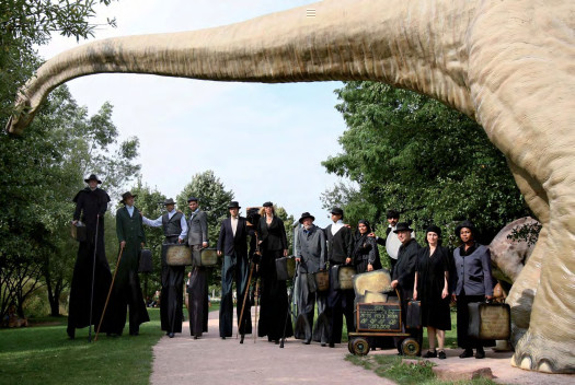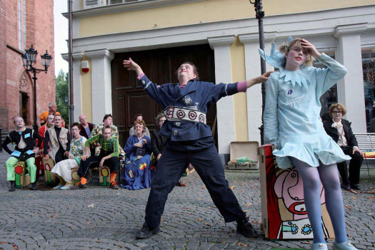 Max und Moritz, die Witwe Bolte, Schneider Böck, die „fromme“ Helene – weltweit bekannte Figuren aus Wilhelms Buschs satirisch-komischen Bildergeschichten bevölkern den Platz. Wie die Figuren erfahren auch die Geschichten Buschs ihre spezielle Interpretation durch die Schauspieler von „Meine Damen und Herren“._Angelehnt an die Moritatenform kommentiert ein kleines Musikensemble mit Akkordeon, singender Säge, Stimme und Standschlagwerk das Geschehen und gibt dem skurrilen Bilderreigen zugleich die Form. Eine Straßenperformance nach Kostüm- und Bildentwürfen der Künstlergruppe „Die Schlumper“.